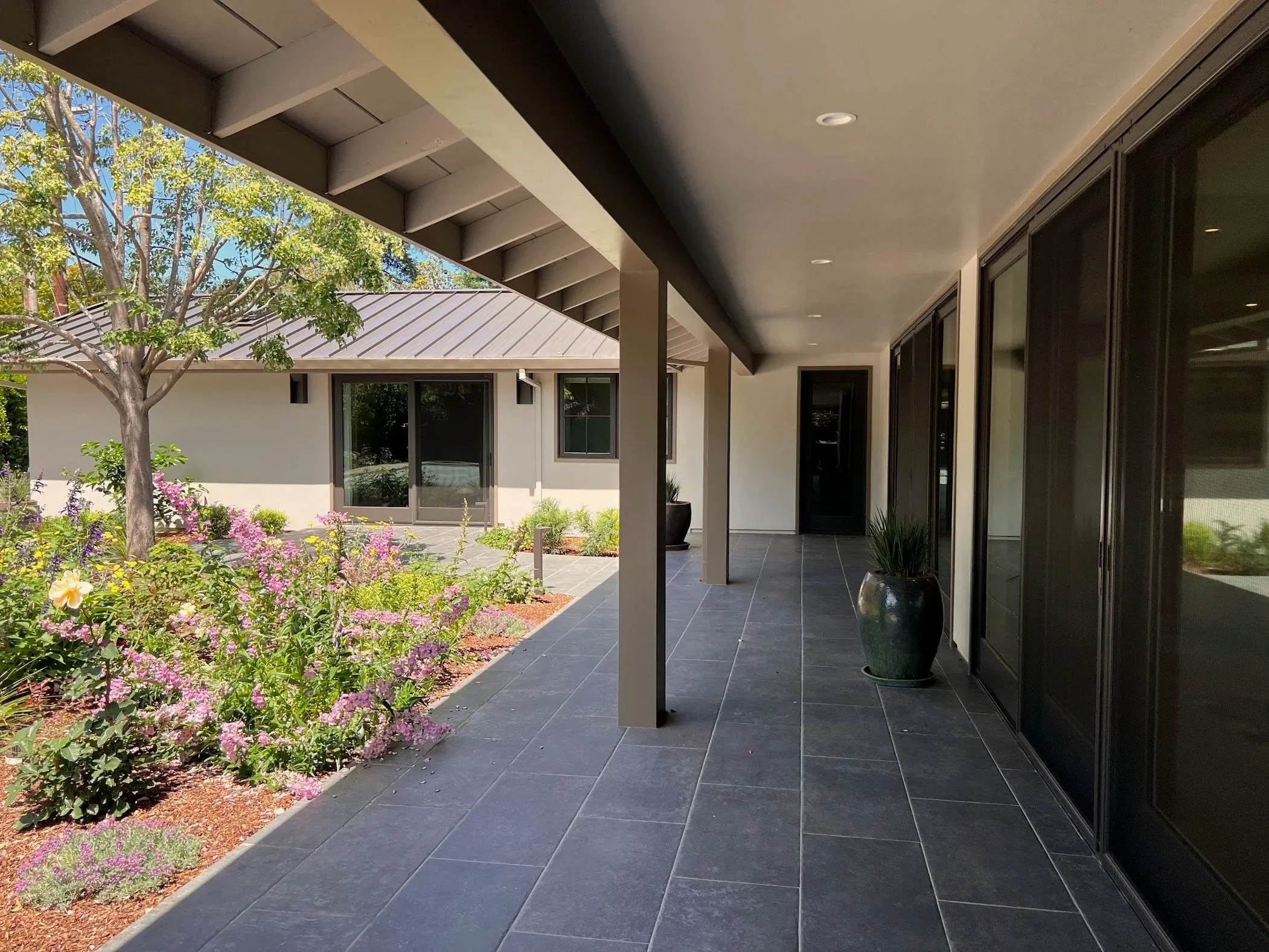 This modern garden shapes the home with simple elegance, mixing clean stone terraces and large planting areas. At night, glowing trees stand out against the sky, reflected in the pool. Fire and light gather people for lively nights or calm times, making the space feel warm, timeless, and full of life.