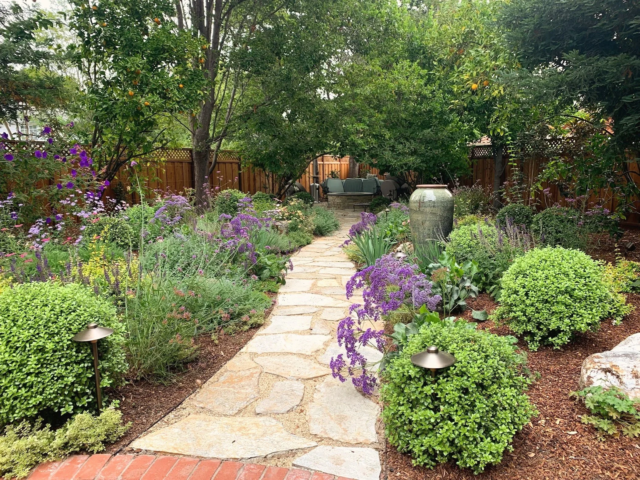 What was once a flat lawn shaded by trees has been reimagined as a living tapestry. A winding stone path now leads through layers of perennials, shrubs, and seasonal blossoms, anchored by a timeless urn fountain. This garden is a place to linger - colorful, welcoming, and full of quiet discovery.
